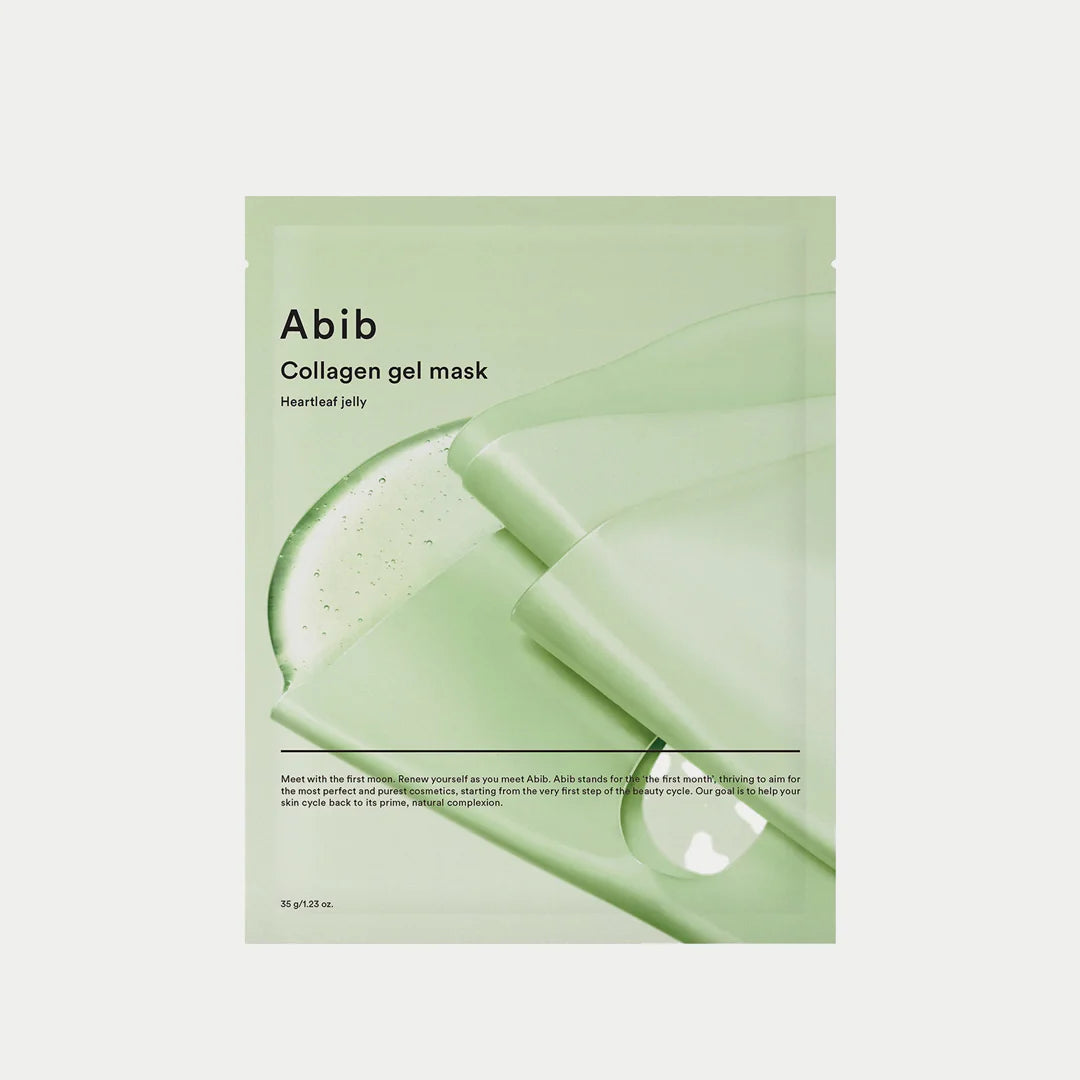 Abib Collagen Gel Mask Heartleaf Jelly is a hydrogel mask formulated with vegan collagen extract derived from fermented yeast to restore glow and promote skin elasticity.