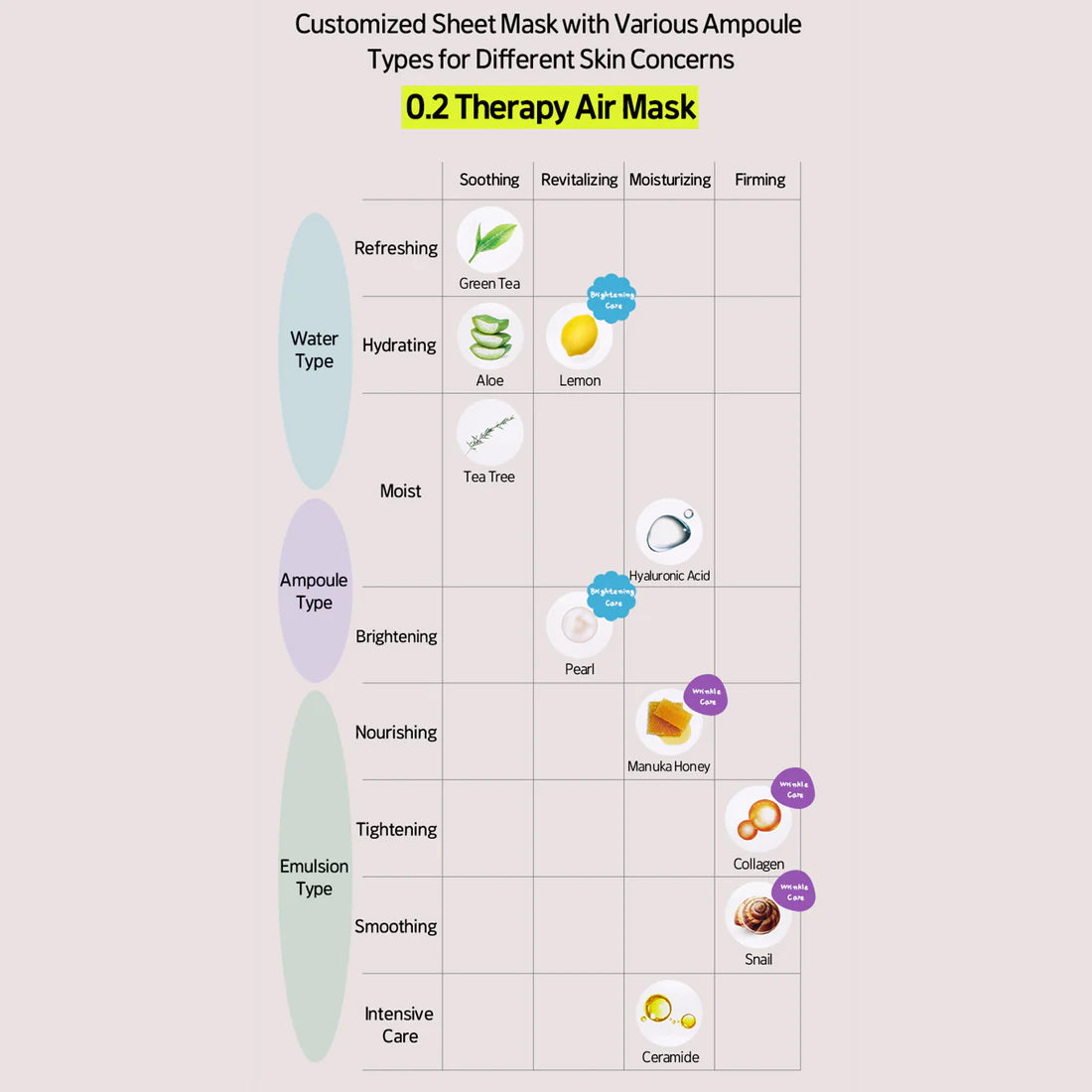 ETUDE HOUSE 0.2 Therapy Air Mask is the brand's best-selling sheet mask suitable for daily use. It is available in many variants to address a range of skincare needs. Each mask is infused with a unique and naturally-derived essence to target specific skin concerns. There are three types of essences used to treat different skin conditions: water, ampoule, or emulsion. Whether you're looking for a brightening, hydrating, soothing, or anti-aging effect, there's an Air Therapy Mask for you!