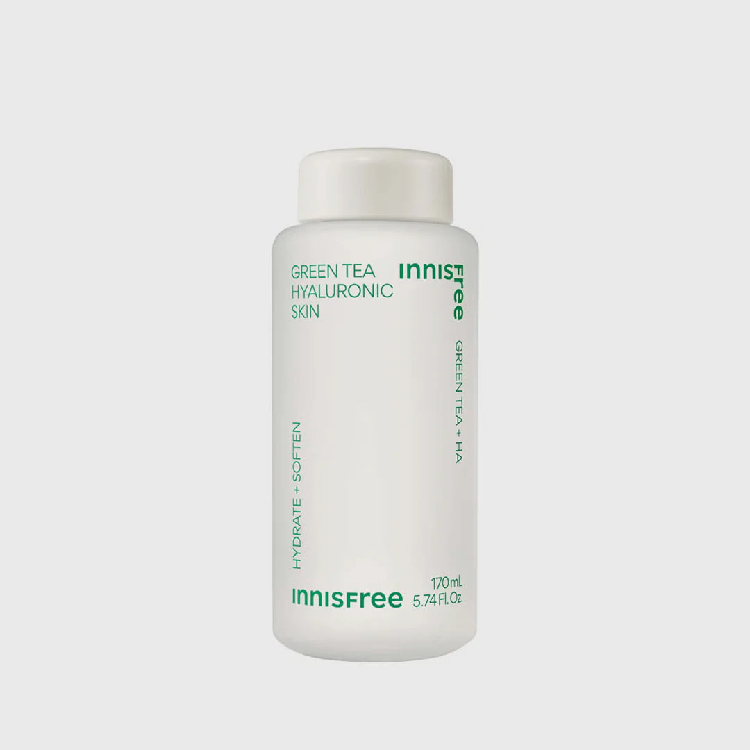 Innisfree Green Tea Hyaluronic Skin is a toner infused with lactobacillus ferment lysate, camellia sinensis leaf extract, and panthenol to support skin cell turnover and replenish skin barrier. Featuring 5 types of hyaluronic acid, its lightweight, fast-absorbing formula delivers deep hydration with a smooth, non-sticky finish.