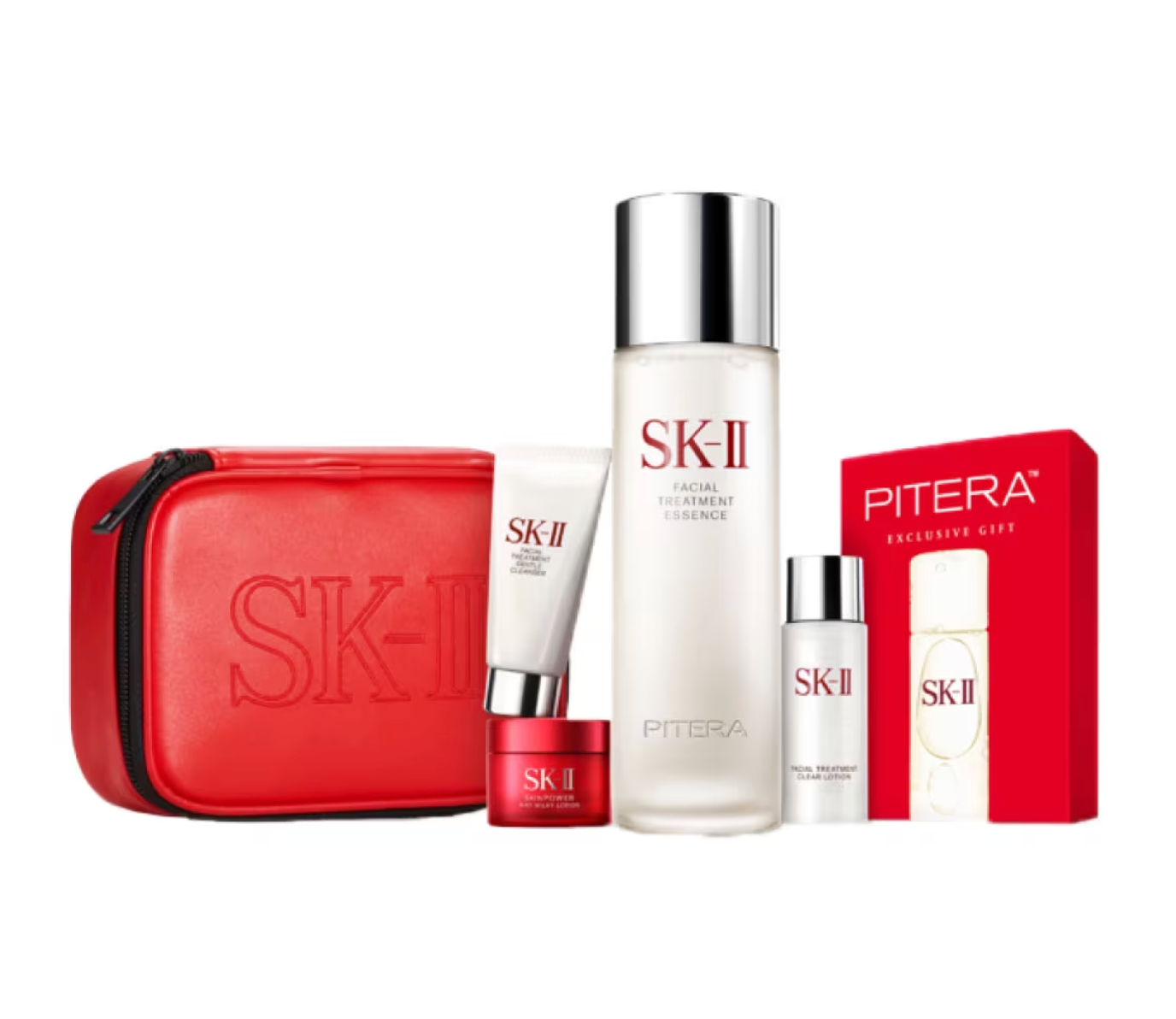 Set includes: SK-II Facial Essence 230ml, SK-II Facial treatment clear lotion 30ml, SK-II Facial Treatment Cleanser 20g, SK-II Skin Power 15g, SKI-II Make-up pouch.